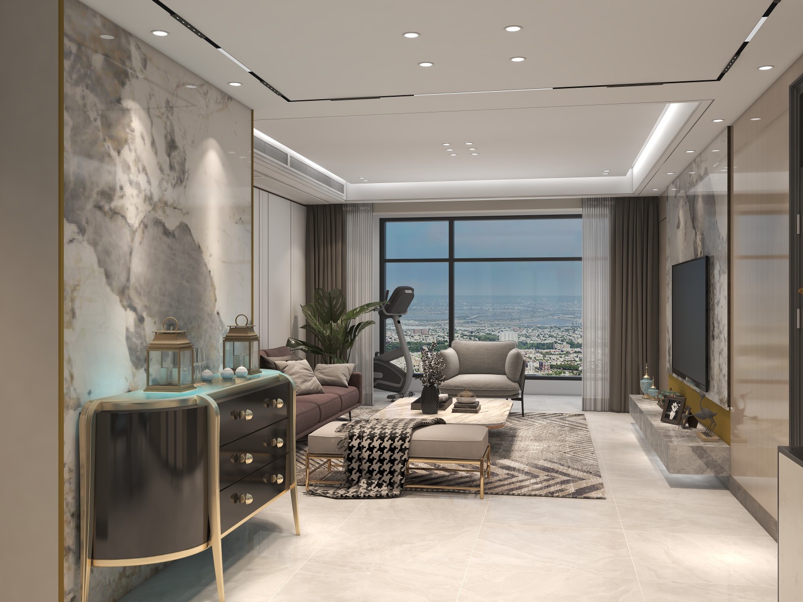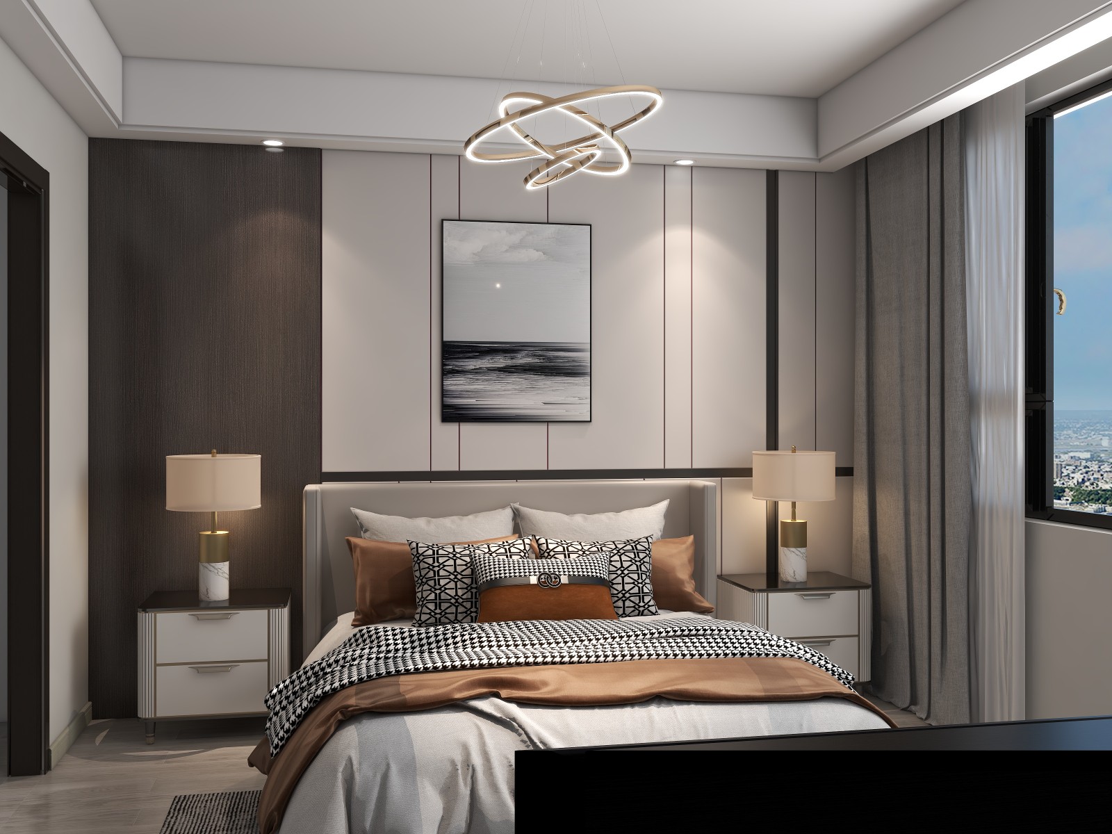 優雅的灰色耐看且耐臟,搭配以簡約的素雅山水畫,讓空間流淌著清新的古韻氣息。大面積的落地窗則讓室外美景一覽無余。