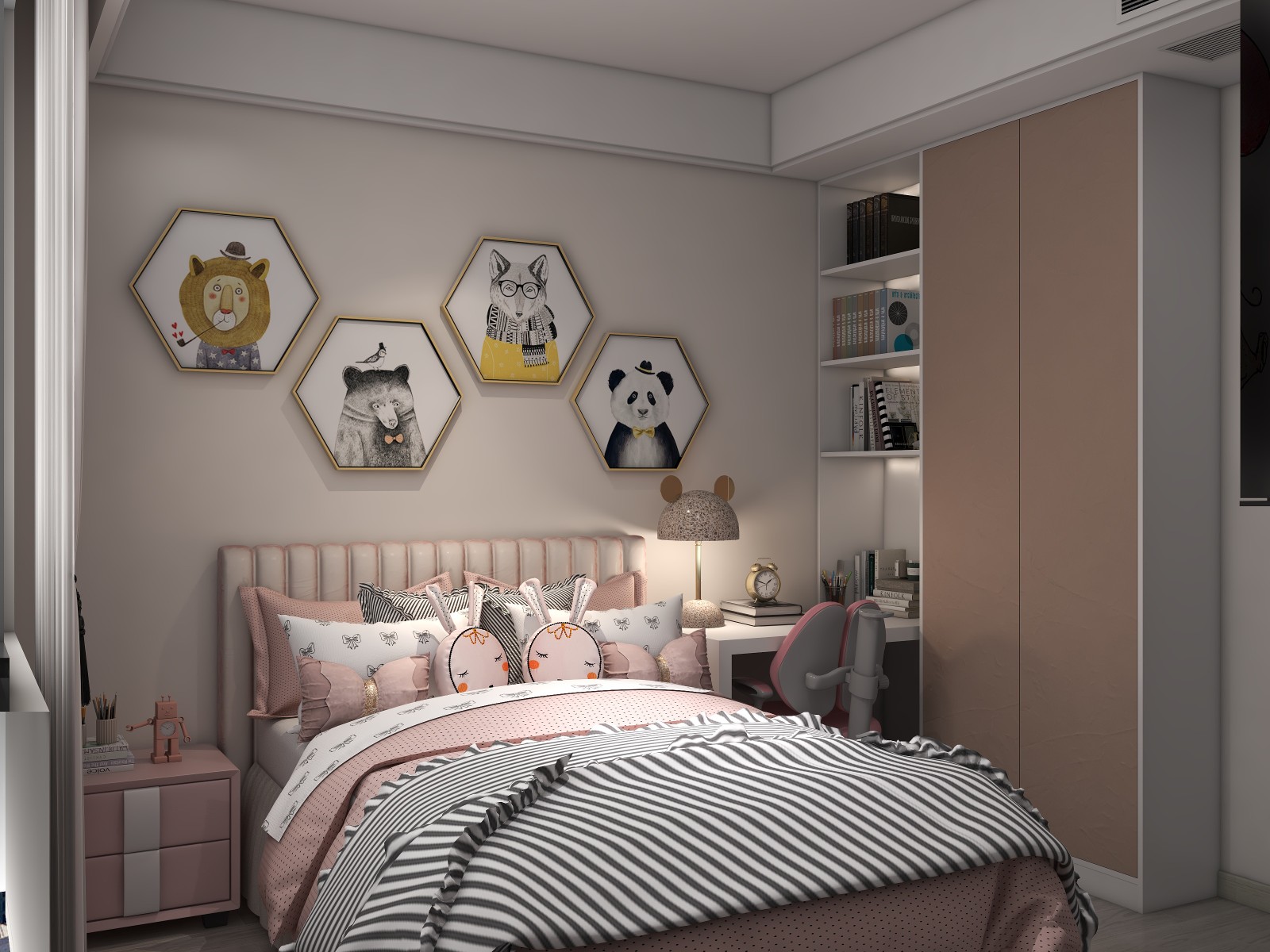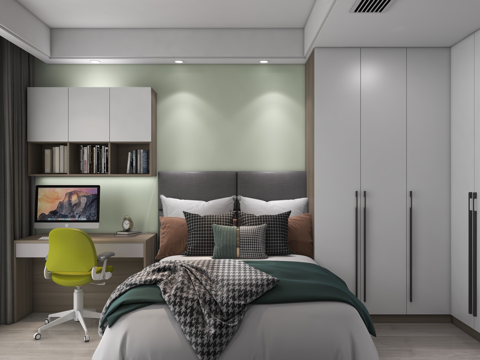 淡綠色墻面搭配上白色衣柜,整體強調清新簡潔感。而床頭柜處則背帶按照成一個迷你辦公區,有效提升空間利用率。