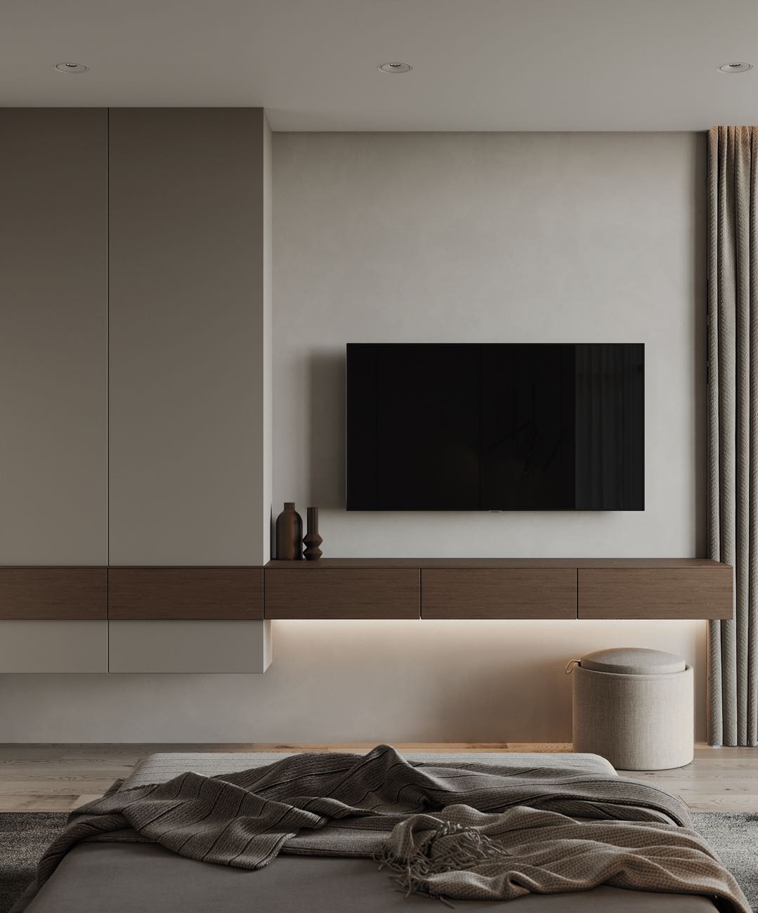 該區(qū)域沿用了與客廳一致的配色,強調(diào)整個家居環(huán)境的銜接感。墻面借助置物臺的變化放置裝飾空蕩的墻面,為空間增添藝術(shù)時尚氛圍。