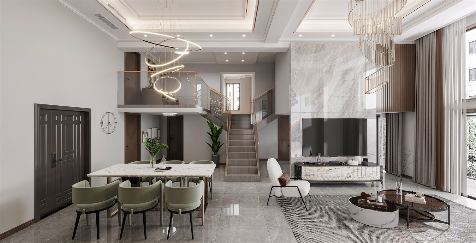 就餐區域被設置在一樓,借助大理石臺面打造餐桌,簡約而又不失輕奢高級感。