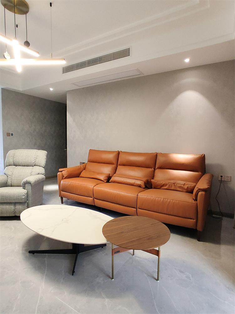 簡約的灰色點(diǎn)綴上亮橘色皮質(zhì)沙發(fā),清新而又不失活潑自由感。
