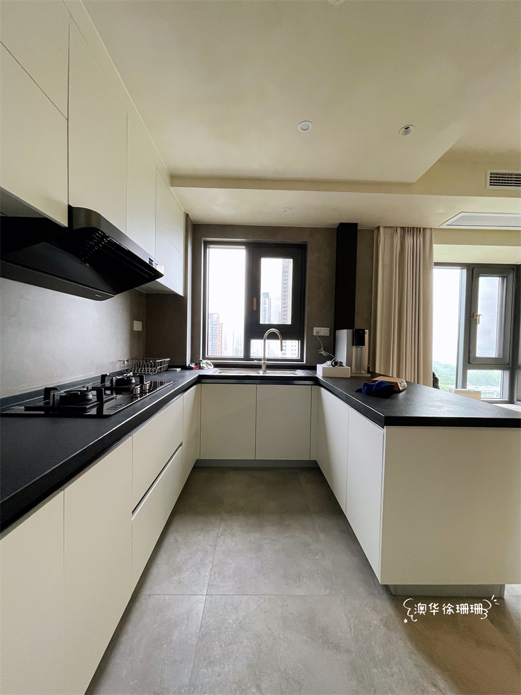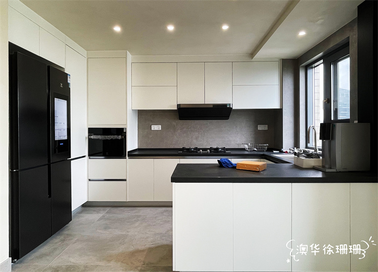 半開(kāi)放式的廚房突出空間通透感,黑白經(jīng)典配色耐看又時(shí)尚。