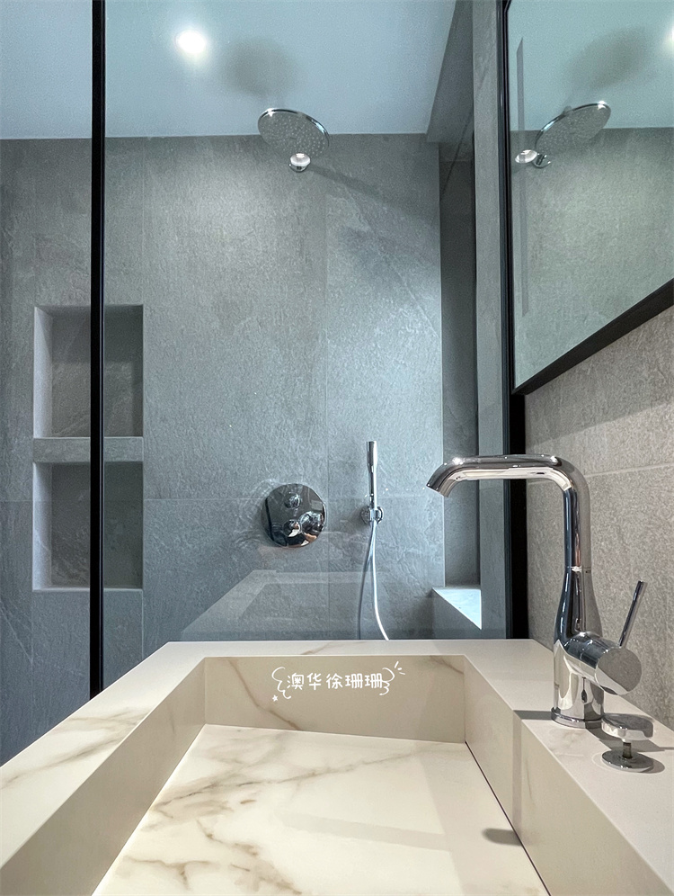衛(wèi)生間區(qū)域借助玻璃推拉門(mén)進(jìn)行干濕分離,同時(shí)利用黑色鑲邊打造空間結(jié)構(gòu)感與層次感。