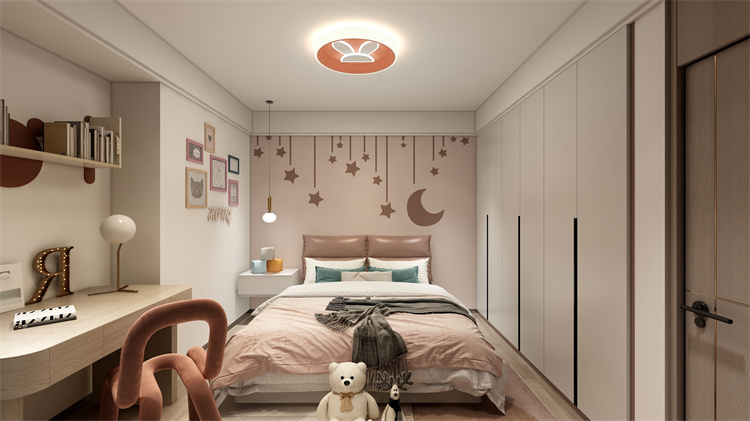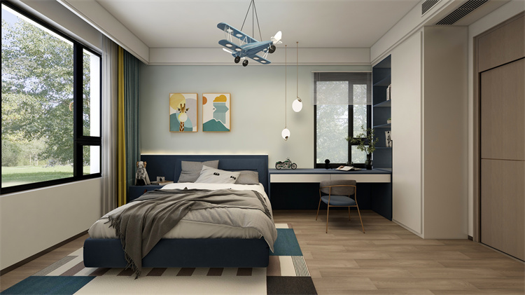 不同深度的藍色組合讓臥室區域的結構感更加明顯,閱讀外面與衣柜的銜接處理則讓空間融合感更加強烈。