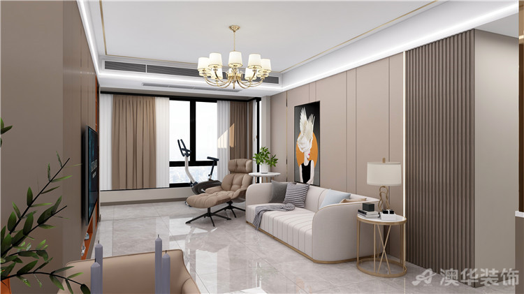 動靜結合的客廳設計效果理想,沙發椅滿足了日常生活中休閑的需要。客廳陽臺放入了健身器材,在家里便可以隨時健身具有理想體驗。