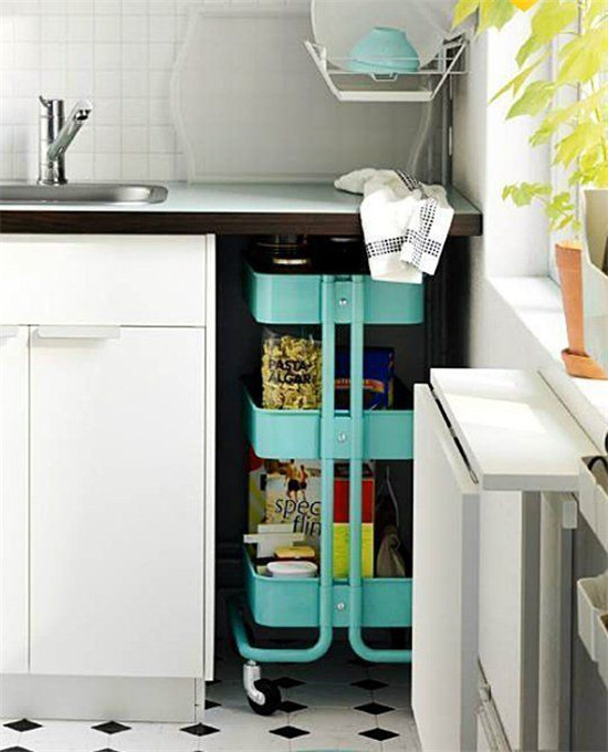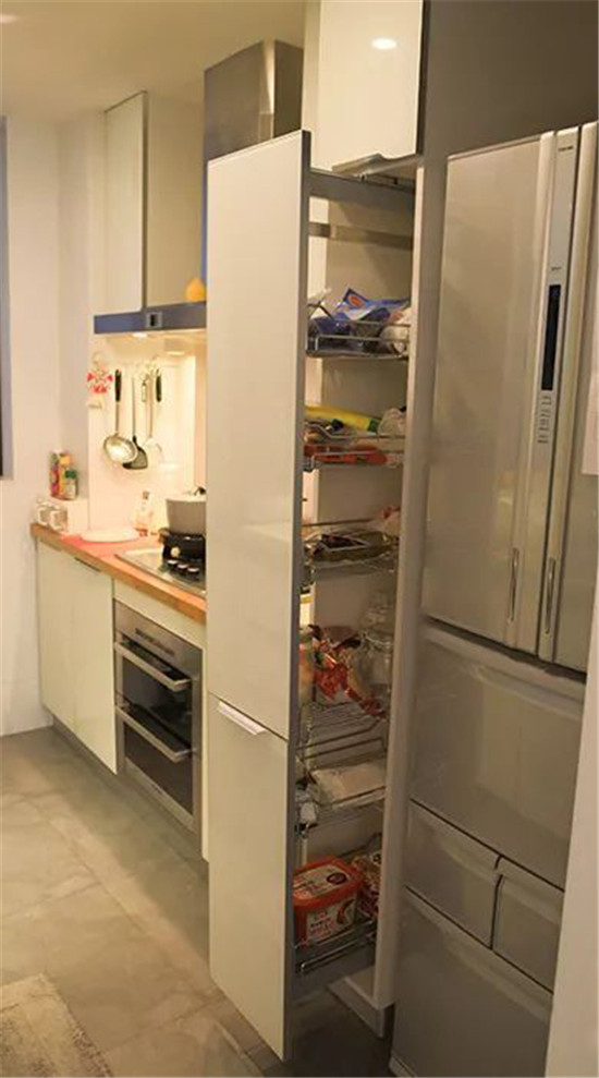 ▲冰箱和墻面之間的縫隙,用小滑輪置物架收納各種瓶瓶罐罐和調味料,這樣廚臺就不會被占用太多空間了,而且油煙也不會沾到調料上。