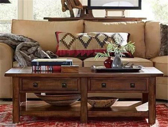 現代很多茶幾采用的是木質形式的,輕巧便捷,這樣的茶幾可以搭配布藝的沙發,簡潔質樸。如果覺得少點兒個性,可以在茶幾下加上一張毛毯,提升整個空間的層次感。茶幾擺放在沙發的正前方,高度略低于沙發,顯得美觀和實用。