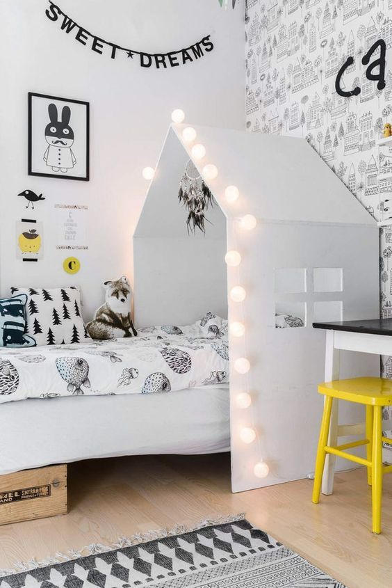 ? ? ? ?融入一些有趣的DIY小細節,一盞燈、一片云、一只布偶、一面黑板墻,會讓兒童房顯得別具一格。