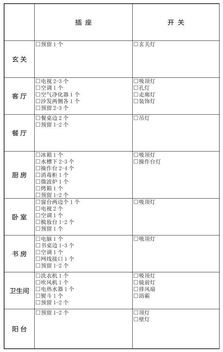 ? ? ??客廳、臥室、書房每個墻面,兩個插座間距不高于2.5米;墻角0.6米范圍內,至少安裝一個備用插座。