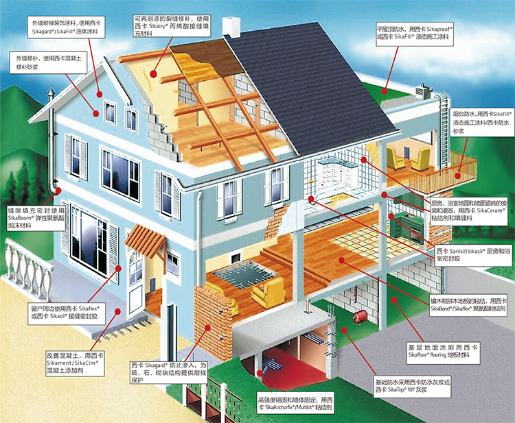 ●產品線:西卡產品遍及防水、密封、粘接、修補、?錨固,灌漿等各個領域。并為建筑室內外各類應用提供全面的裝飾裝修解決方案:廚房、衛浴、陽臺、門窗、客廳地面、墻面、地下室、停車場等均可全面應用西卡高質量的產品。