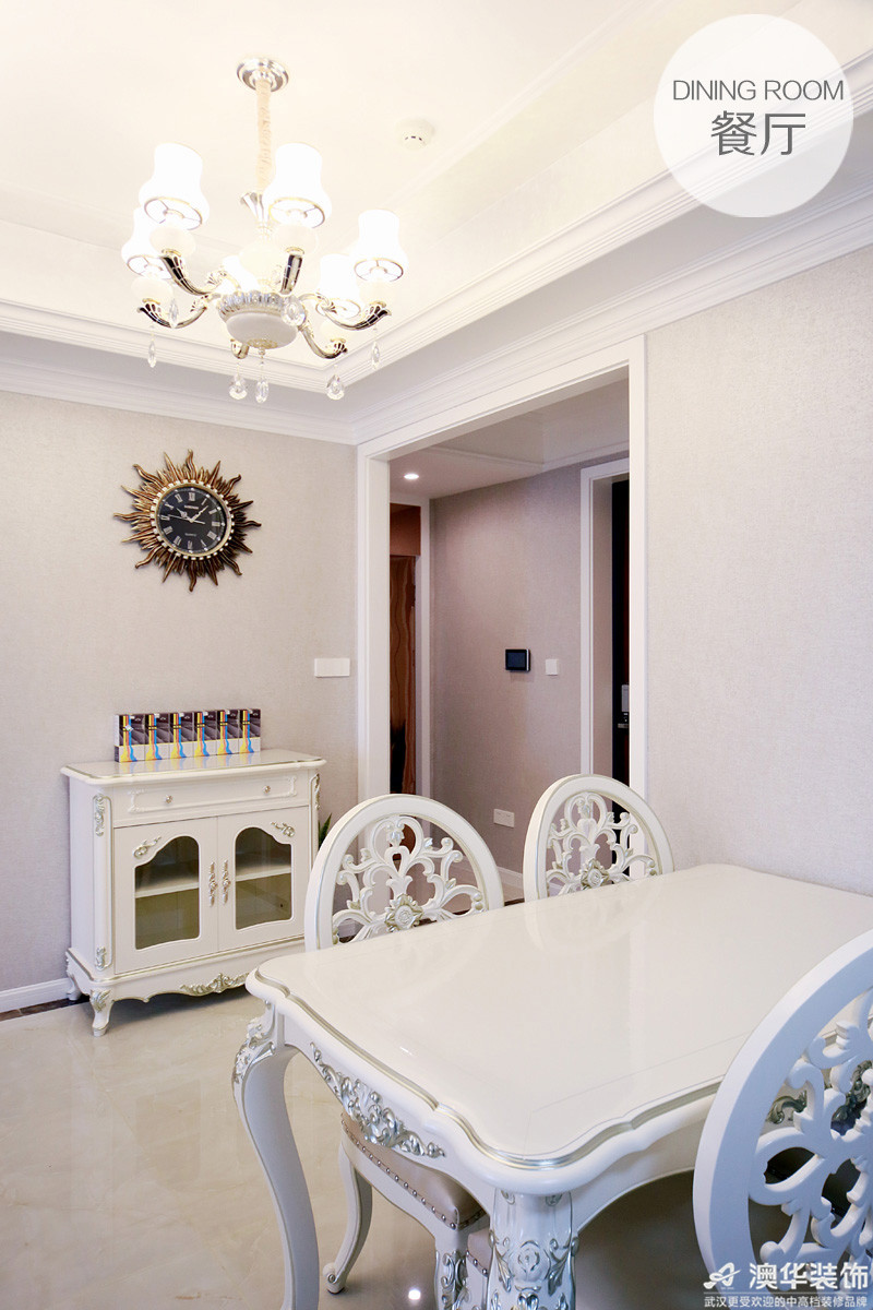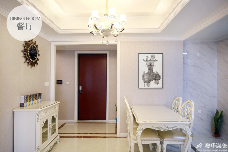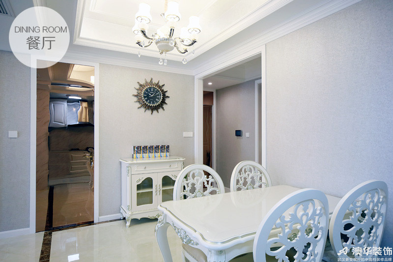 當(dāng)空間嚴(yán)重不足、又不想放棄酒柜時(shí),如何處理?設(shè)計(jì)師在公用墻給出了合理建議:低矮半透明的餐邊柜,柜內(nèi)存放酒杯、柜面陳列裝飾品,墻上那幅古銅色掛鐘是點(diǎn)睛之筆。