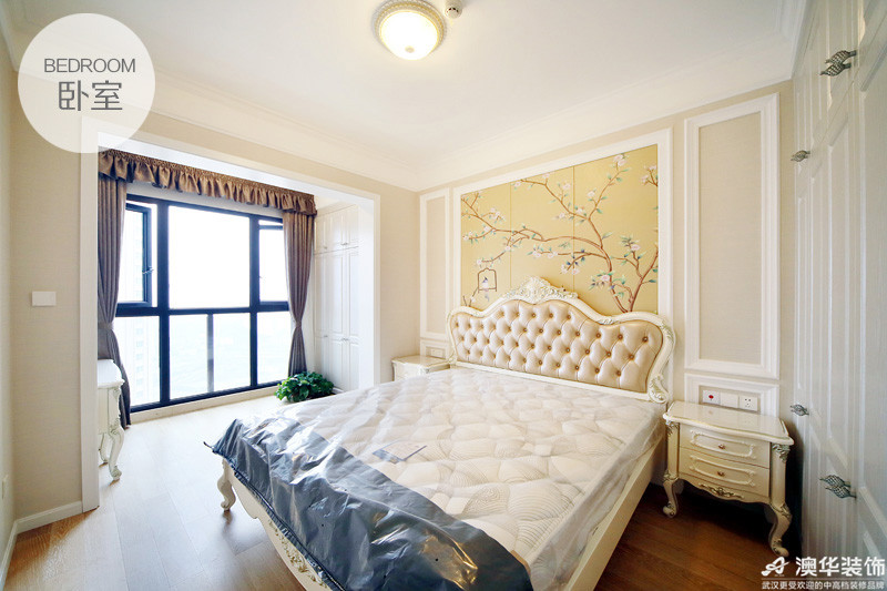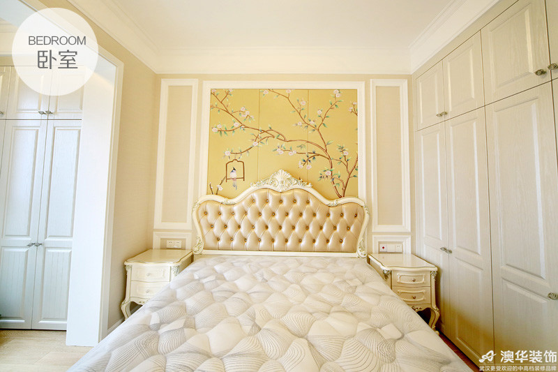 臥室配置,簡(jiǎn)潔中透著典雅的韻味。經(jīng)典歐式靠背、石膏護(hù)墻板、春日私語(yǔ)墻布,在原本極簡(jiǎn)的硬裝環(huán)境下,精致優(yōu)雅卻不過(guò)分華麗。