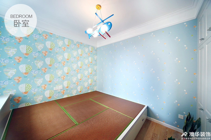 作為兒童房,布局之外也要適當(dāng)增添符合該年齡層的裝飾,比如沿著墻面上升的熱氣球、空中翱翔的飛機(jī),閃閃發(fā)光的小星星……