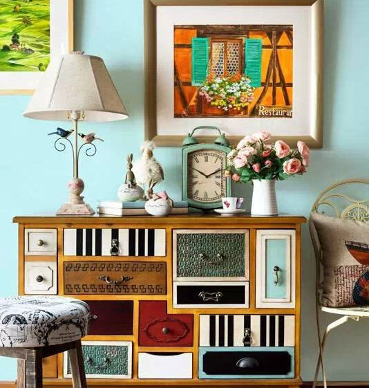 ? ? ? ?多彩的柜面美觀又可增添一分熱鬧的氛圍,而柜子之上有趣的動物玩偶更是帶來一份靈動。配合顏色絢麗的畫作和與柜面顏色相呼應的鐘表,使整個空間色彩豐富而有序。