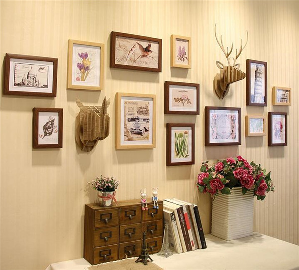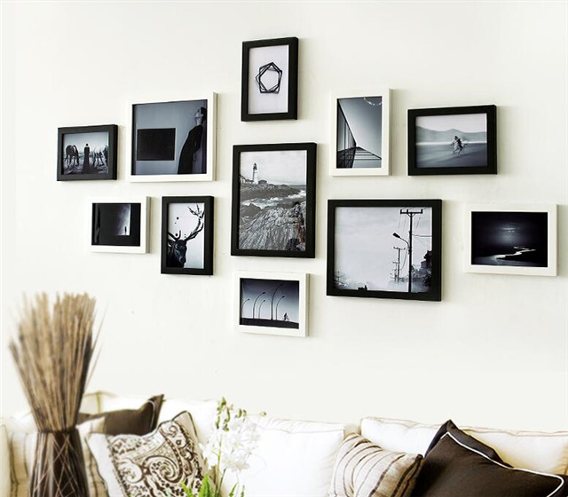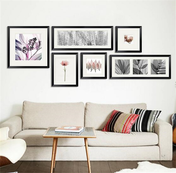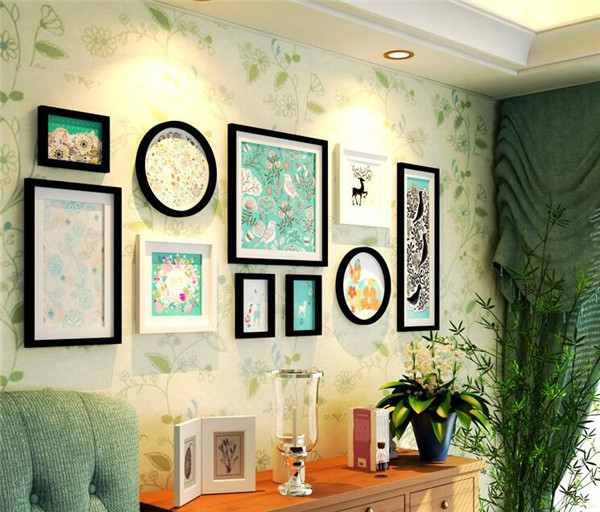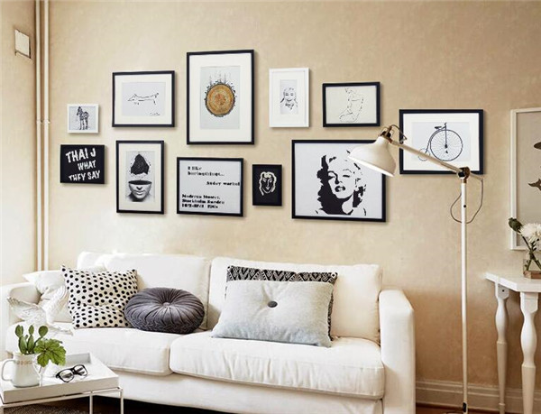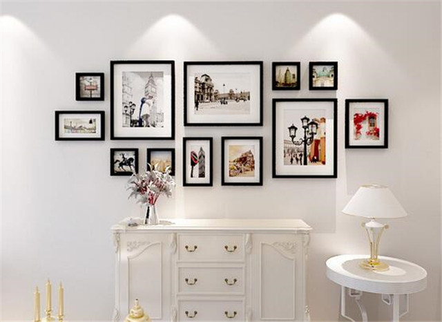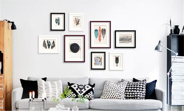 3、同一組照片墻的顏色組合不建議太多,最好不要超過三種!盡量和同一視覺范圍的某樣家具顏色一致。比如茶幾,比如一個臺燈,比如窗簾等等。這是比較不容易出錯的方法,有設計師的話,可以嘗試更跳躍和夸張的顏色搭配。
