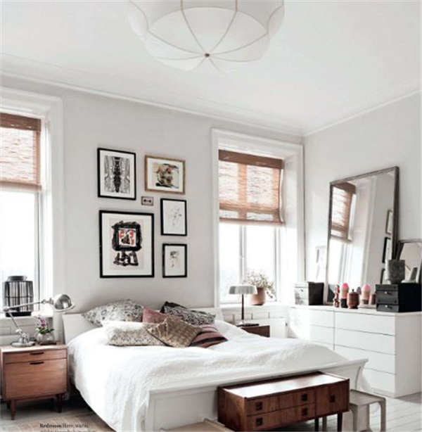 ?床背后的墻面最通常的做法是單獨放一張超大照片,但如果還是覺得太空希望墻面能再豐滿一點,不妨放上一橫一豎兩張主圖,幾張小圖填補空角。既不失簡潔又有錯落感。