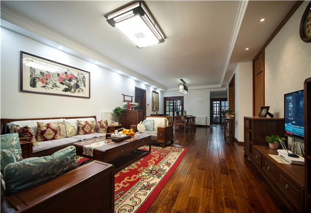 客廳:吊頂簡單自然,沒有多余點綴,配以中式燈具,莊嚴大氣。實木家具的擺放中規中矩,講究對稱分布。滿眼的實木烘托出濃濃的厚重感;一幅中國字畫,格調高雅;花紋繁復地毯和抱枕點綴其中,瞬間提亮了整個空間。