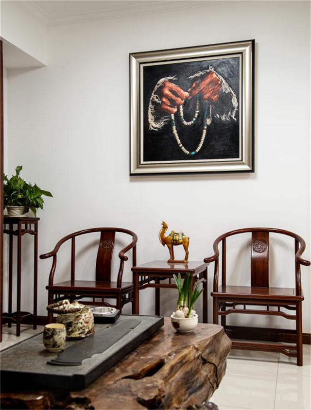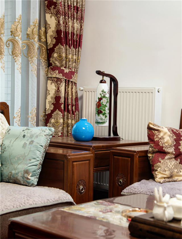 客廳一角:中式實木沙發,扶手處雕刻中式門環,小巧生動,細節處顯心思。一旁的懸掛瓷器飾品和藍色寶瓶,中和了實木家具的質樸于厚重。