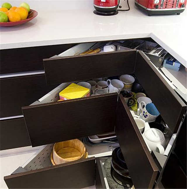 拉籃不僅能最大限度的使用內(nèi)置空間,還能將拐角處的廢棄空間充分利用,實(shí)現(xiàn)使用價(jià)值的最大化。轉(zhuǎn)角處的拉籃設(shè)計(jì)解決了櫥柜尷尬位置問(wèn)題,合理分區(qū)適合擺放各種尺寸的小物件,抽取式設(shè)計(jì)取用起來(lái)也格外方便。