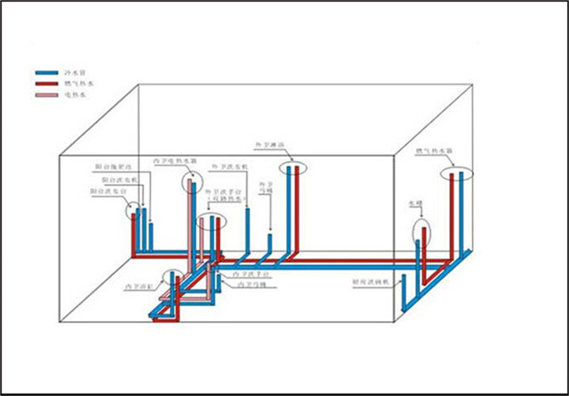給水走向圖是關于廚房、衛生間等處的給排水線路布置圖,給水管道的管徑尺寸、取水位置及高度、管線排布系統等是該圖的重點。