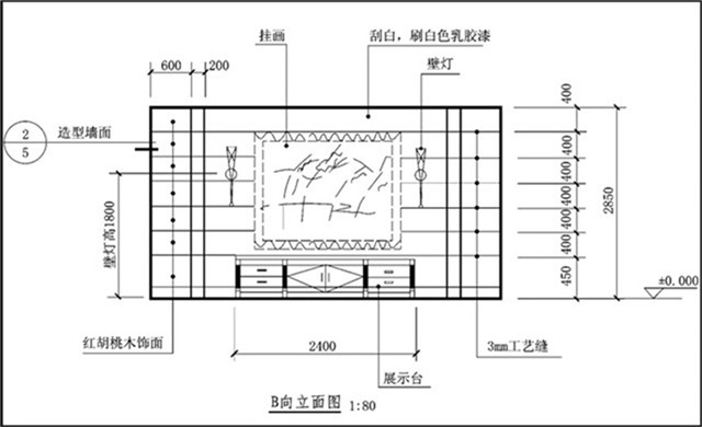 立面圖、局部放大圖和節點詳圖即從水平角度看到房間局部的剖面圖紙,它包括墻體定位尺寸,各部位裝飾墻面造型的立面圖形、尺寸、構造材料、面層材料名稱;各房間、各部位固定家具造型的立面造型、尺寸等。