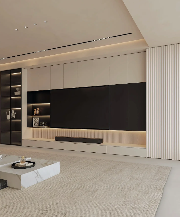 客廳里的滿墻電視柜和普通衣柜不一樣,90%的情況都應該選擇無拉手的設計,盡量營造出一種干凈整潔的電視墻氛圍感。