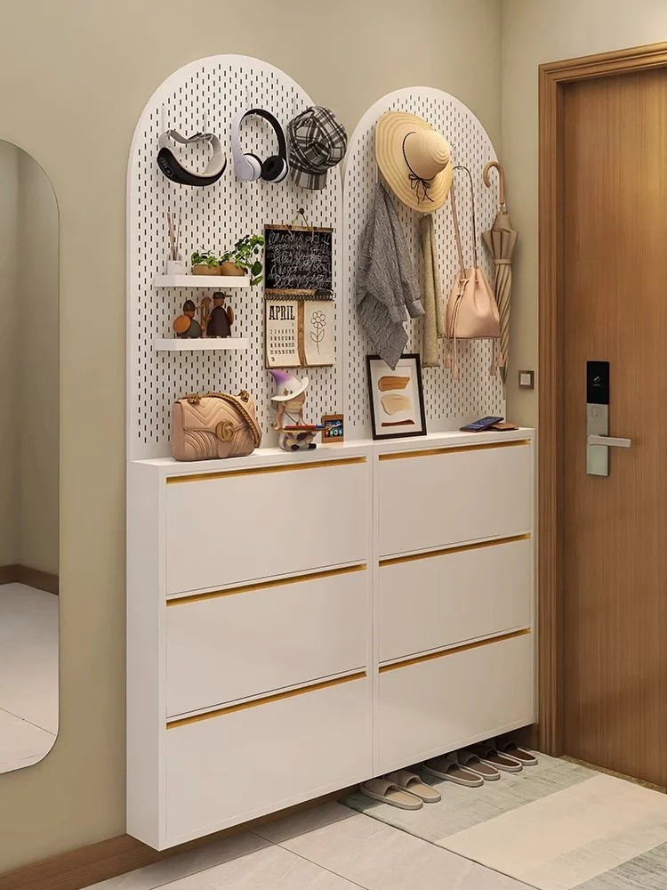 對于鞋柜上方,可以安裝上洞洞板,洞洞板不占空間,布局更靈活,可用來裝飾,也可以掛一些小物件。