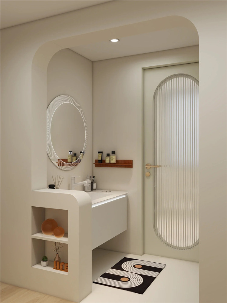 外置洗手臺可以采用半墻的設計,然后在半墻上加上美觀的玻璃屏風或木質隔斷,既保護了隱私,又不會擔心洗手臺區域雜亂不美觀。
