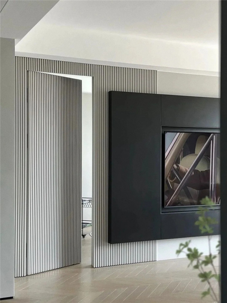 平開式最常見,沒有門套,顏色、材質(zhì)看起來與墻面一致,并搭配直線條來弱化門框和縫隙,幾乎所有室內(nèi)門都可以用。