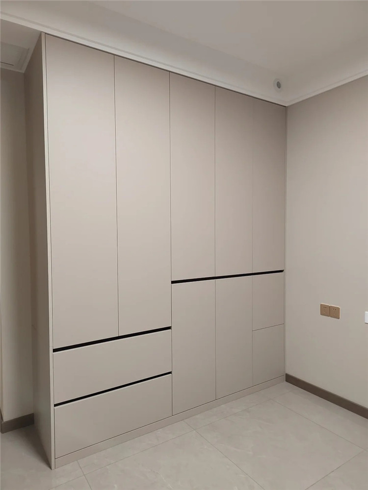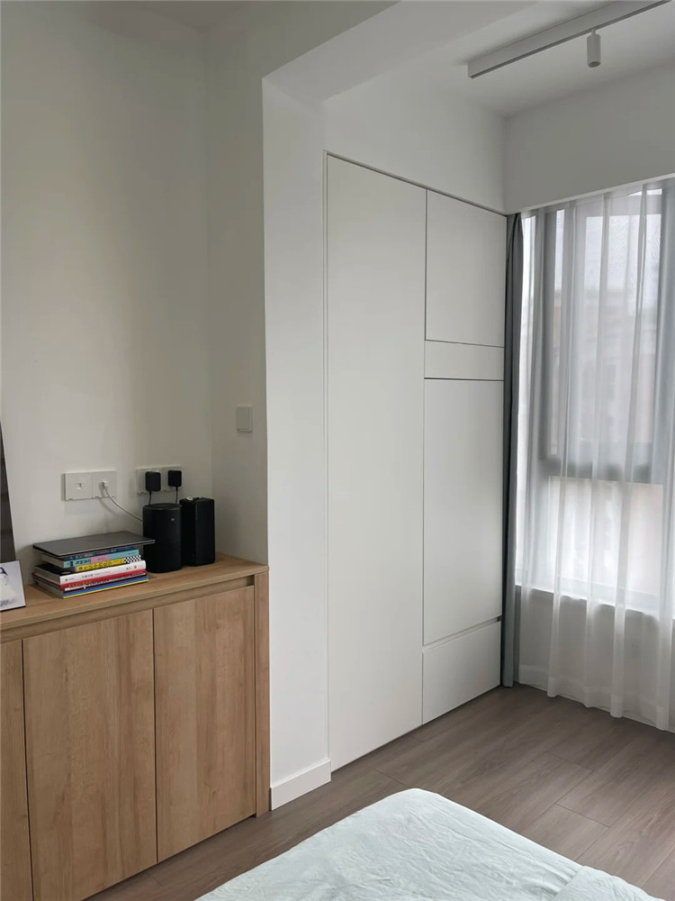 利用戶型優(yōu)勢,把柜子隱藏起來,與整體造型一致,既能滿足收納空間,又能很好的“隱形”。