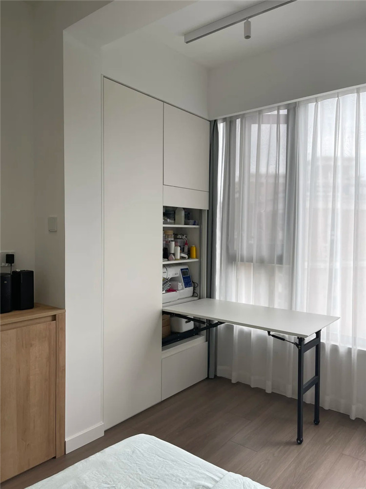 隱形桌也是一種不占空間且非常實用的設計,平時隱藏于柜體之中,使用的時候再拿出來即可,常見的設計方法有抽拉式與折疊式。