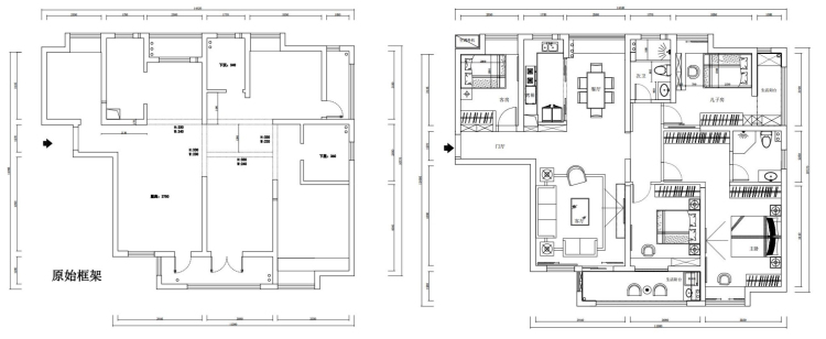 菩提苑這所187㎡的四居室住宅采光并不算很好,因此設計師在進行規劃設計的時候將多個空間的墻面都打通,將更多的陽光引入室內,以提升室內采光度。同時,將陽臺面積放大,并打造成一個與室外帶有視覺銜接感的休憩空間,以滿足年輕夫妻的觀賞需求,有效的提升了生活的品質感。為避免過多歐式元素帶來的壓迫感,設計師選用了相對比較簡約素雅的色彩作為空間主基調色,以提升空間大氣美。