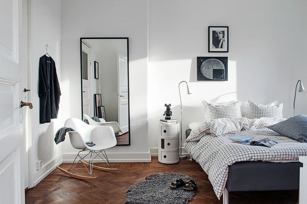 沿著家具、床邊、墻沿,順勢鋪上長條形的地毯,豐富空間的視覺延伸感。