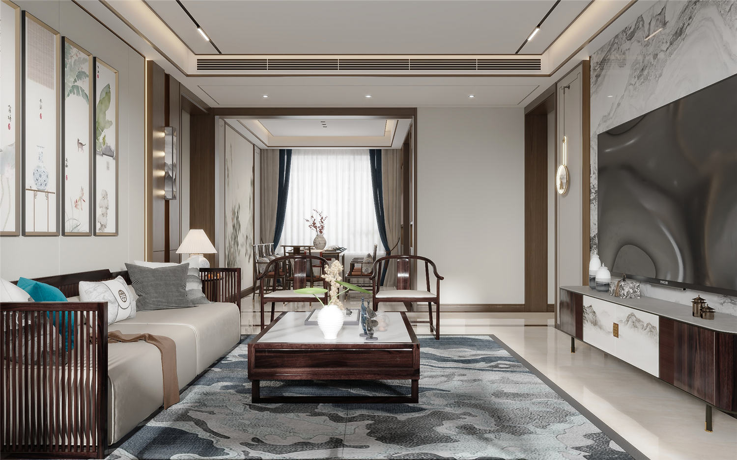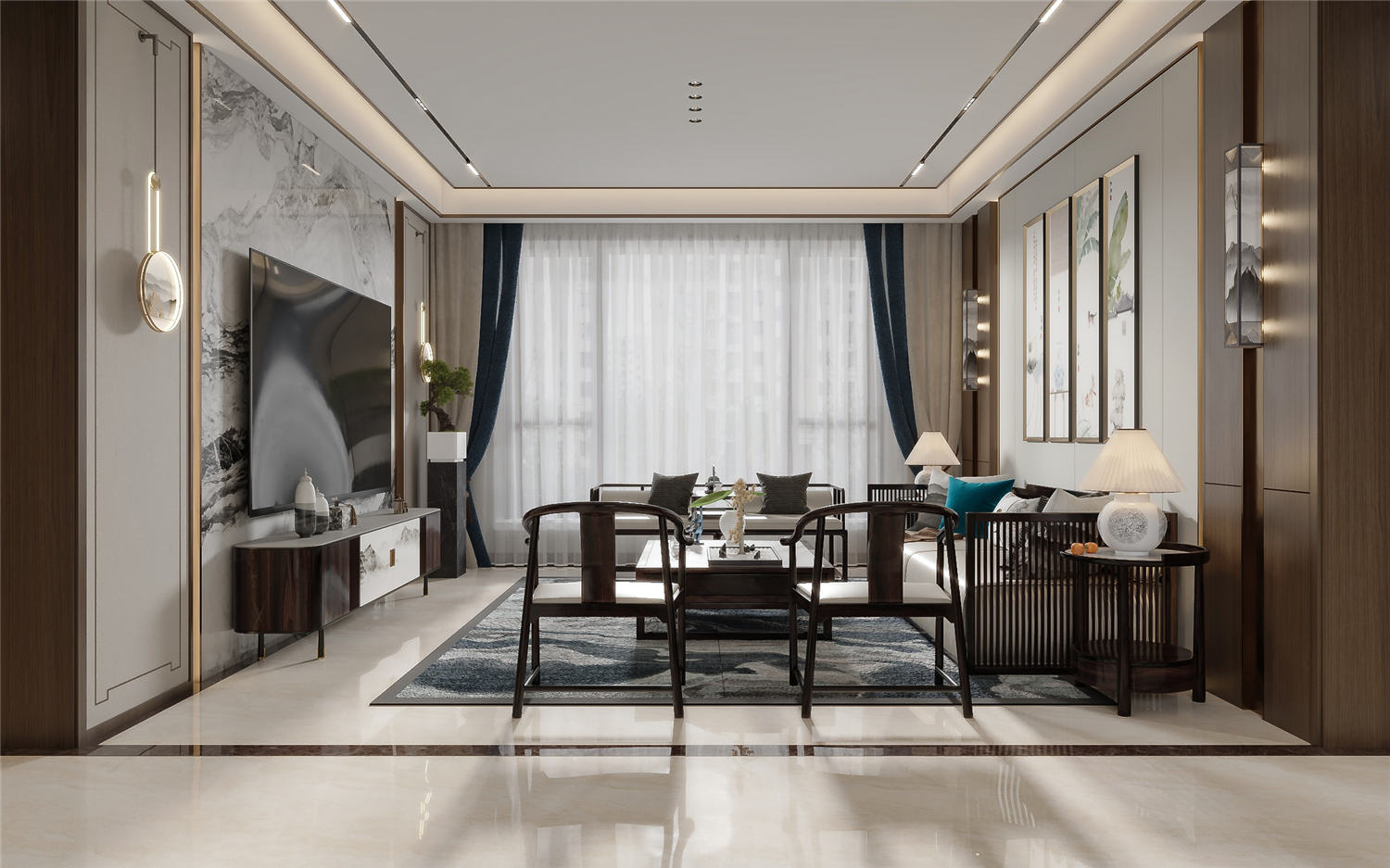 嵌入式的電視背景墻點綴上風格青花瓷花瓶,讓空間中流淌著優雅古韻。