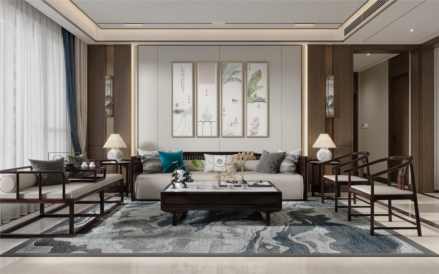 大面積深褐色的木質地板搭配上清新掛畫,讓中式風所特有的典雅韻味得到很好的表達。