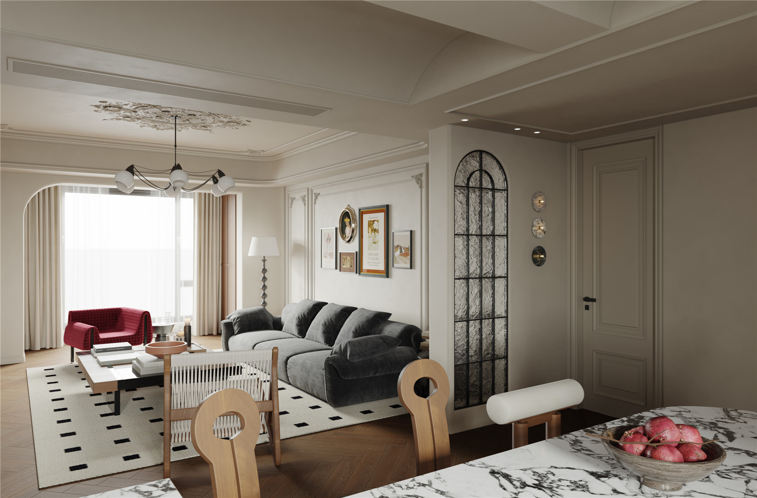 復地東湖國際7期這套三居室住宅的面積約為133㎡,原有的戶型結構已經能夠滿足業主基本使用需求,因此設計師沒有在空間規劃上進行再改動。由于房屋走廊過道相對比較狹小,因此設計師借用色彩的搭配使用從視覺上起到擴大空間的作用。兒童房外部區域則與客廳陽臺打通,改造成為一個大面積休憩空間,以滿足業主及家人休憩、觀賞需求。