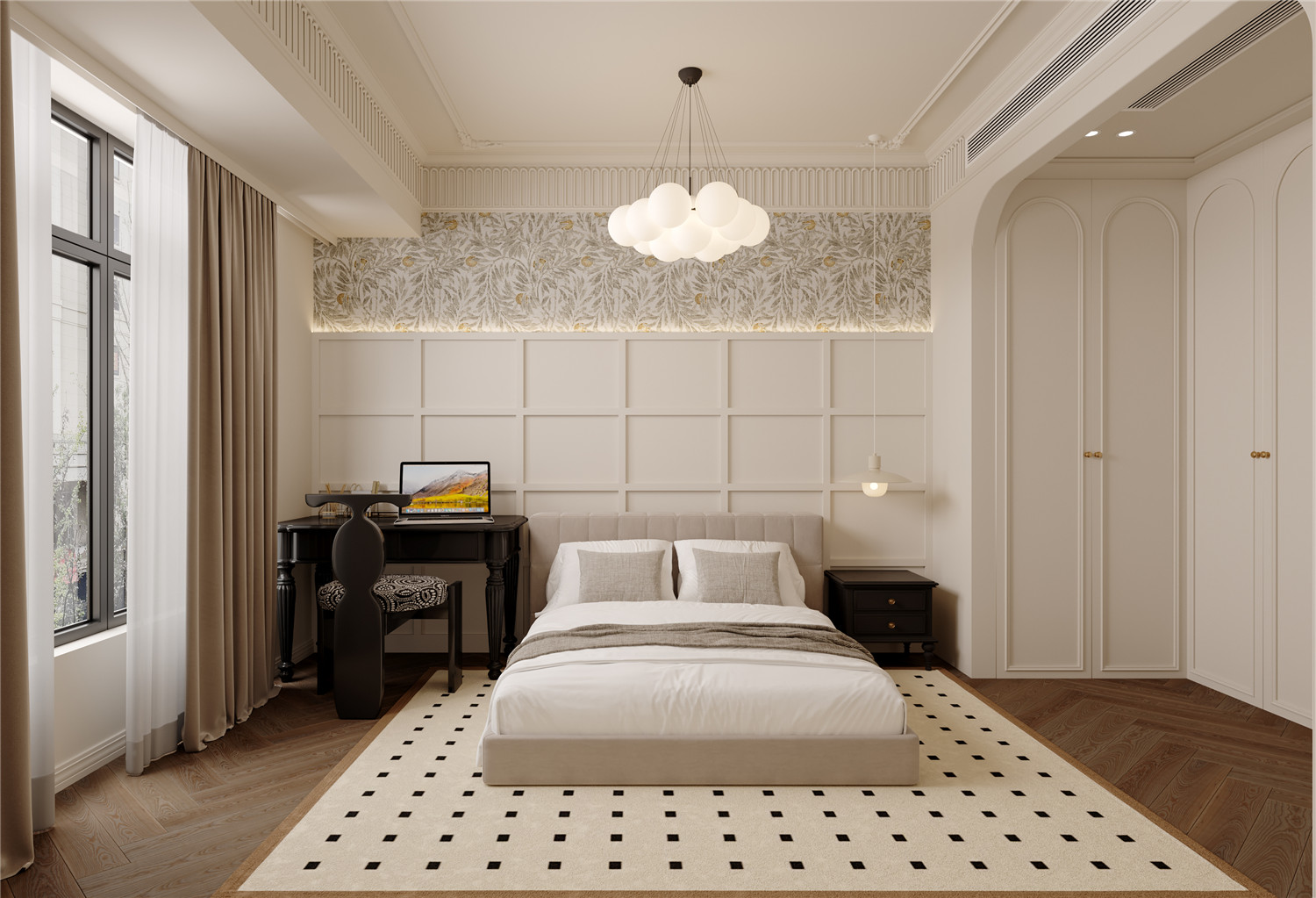 臥室區域使用了大面積的淺色作為主基調色,營造溫馨柔和氛圍,而撞色的床具則讓整個臥室更具個性感。