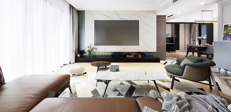金科城這套126㎡的三居室住宅雖然面積相對(duì)較大,且南北通透、采光好,但是由于原有的空間結(jié)構(gòu)劃分并不夠合理,存在著一些細(xì)節(jié)不足,因此需要設(shè)計(jì)師合理的化解空間劣勢(shì)。為了降低大面積客廳帶來(lái)的空曠感,設(shè)計(jì)師將陽(yáng)臺(tái)區(qū)域向內(nèi)進(jìn)行擴(kuò)大,并改造成一個(gè)大的休憩、觀賞區(qū)域。同時(shí)將客廳內(nèi)部區(qū)域借助軟隔斷改造成就餐區(qū)域,滿足使用需求的同時(shí)降低客廳過(guò)大帶來(lái)的單調(diào)氛圍。