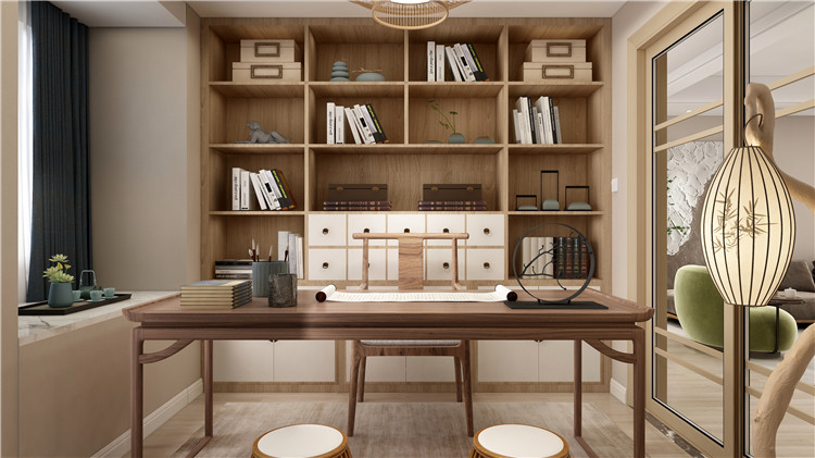 簡約的書柜以及工作的座椅可以感覺到現(xiàn)代的氣息,書房的燈也透露出來一種藝術感。