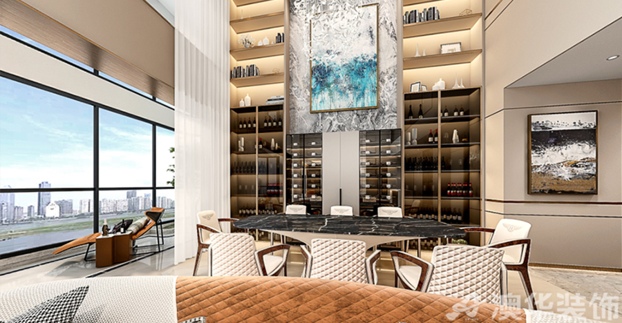 巖板的電視背景墻扶搖而上,彰顯大氣風范。電視內嵌其中,邊側以金屬線條進行勾勒,造型簡單用材精致,低調中呈現出輕奢的貴氣質感。 邊側內嵌酒柜,與餐廳酒柜相呼應,金屬色的橫豎交織條不僅使整個空間 更加有層次,突顯沉穩(wěn)品味。