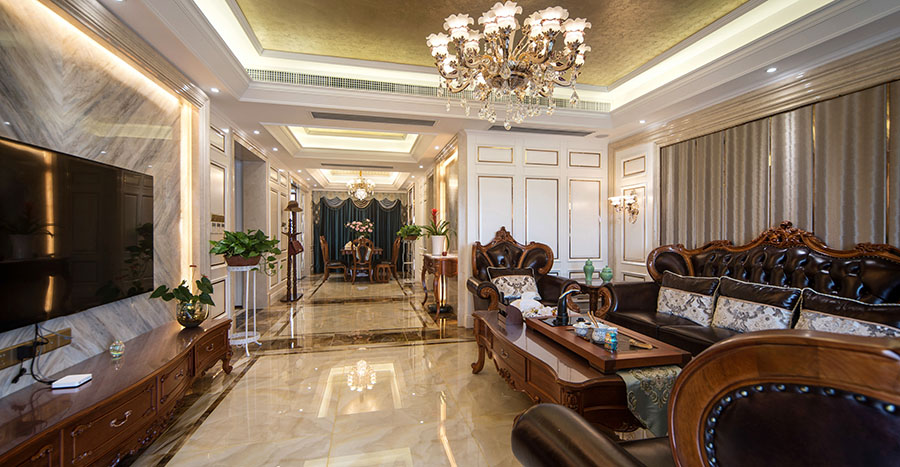 材質上以石材、木飾面為主,點綴金色線條,搭配上精致的水晶燈,營造出一種浪漫的氣息,也極具生活品質。深色家具呈對稱式分布,與大的氛圍和基調相和諧,低調有內涵。