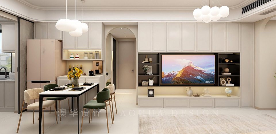 白色和米黃色之間的一種飽和度低的駝色系,色彩充滿清甜感。相對于純白多了一份醇厚,清清淡淡之間呈現出軟糯的溫柔質感,優雅而恬靜,設計元素多采用奶油、石膏線、拱門、壁龕搭配可愛軟萌的家