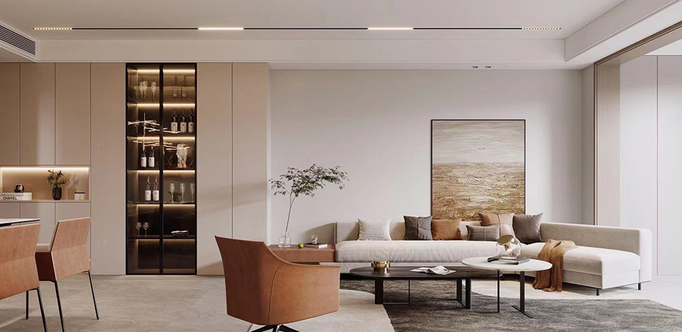 客廳除了是與家人休閑的場域,也是會見親密好友的場所。在充分考量人在該空間情景下的所需后,設計師聚力加大客廳尺度、優化家具配置,客廳的L型沙發,方便拉進人與人間的坐臥距離,選用精致柔軟的飾面材質,坐感舒適,讓人盡享放松。白、棕、灰,三色交錯彌漫,沉淀儒雅的空間氛圍,大理石背景墻如在宣紙上肆意揮灑筆墨,氣質兼具自信與沉靜,呈現不拘一格的藝術調性。