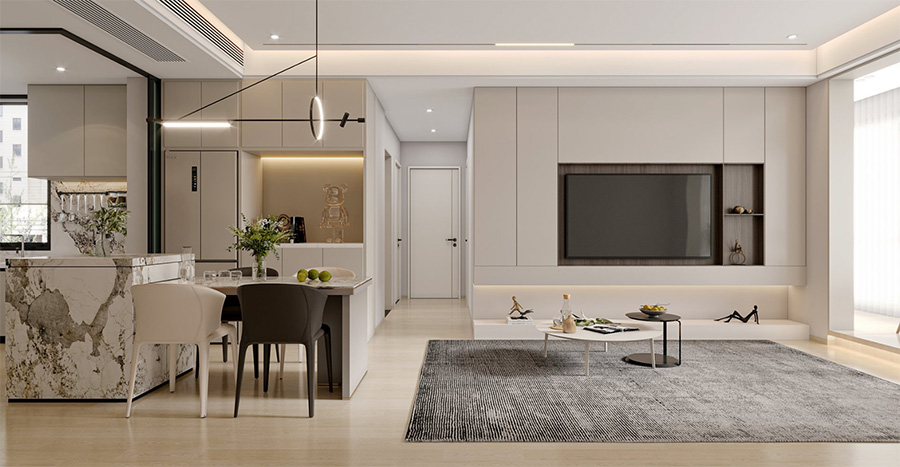 室內設計注重材料的選擇,注重品牌質感,所以更為理性實用。本案位于月亮灣壹號,面積142㎡,3室2廳。